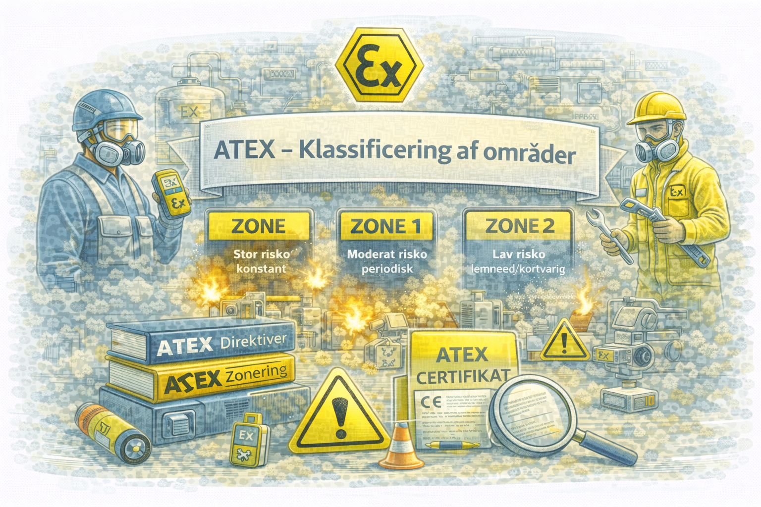 Alle disse elementer skal være koordinerede og dokumenterede, så eksplosionsrisici håndteres systematisk og kontrolleret.