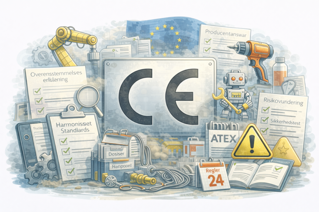 For industrielle maskiner og tekniske produkter omfatter CE-mærkningen typisk krav til maskinsikkerhed og risikovurdering, elektrisk sikkerhed og elektromagnetisk kompatibilitet, funktionel sikkerhed og styringssystemer samt korrekt teknisk dokumentation og brugsanvisning. CE-mærkningen forudsætter en systematisk risikovurdering, korrekt anvendelse af harmoniserede standarder og udarbejdelse af et teknisk dossier, der kan fremlægges ved markedskontrol eller tilsyn.