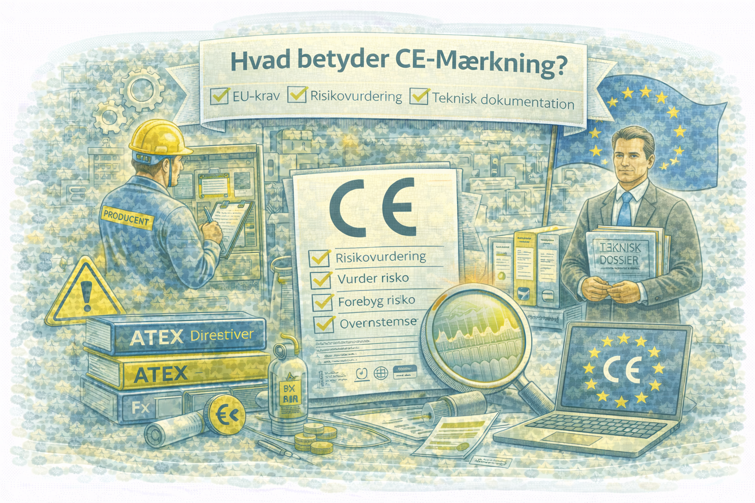 Hvis du importerer, fremstiller, sammenbygger, væsentligt ombygger eller stiller en maskine eller et produkt til rådighed for andre, har du pligt til at sikre korrekt og lovlig CE-mærkning. CE-mærkning kan udføres internt, forudsat at der er indgående kendskab til relevante direktiver og forordninger, forståelse for produktets opbygning samt styr på risikovurdering og dokumentation.